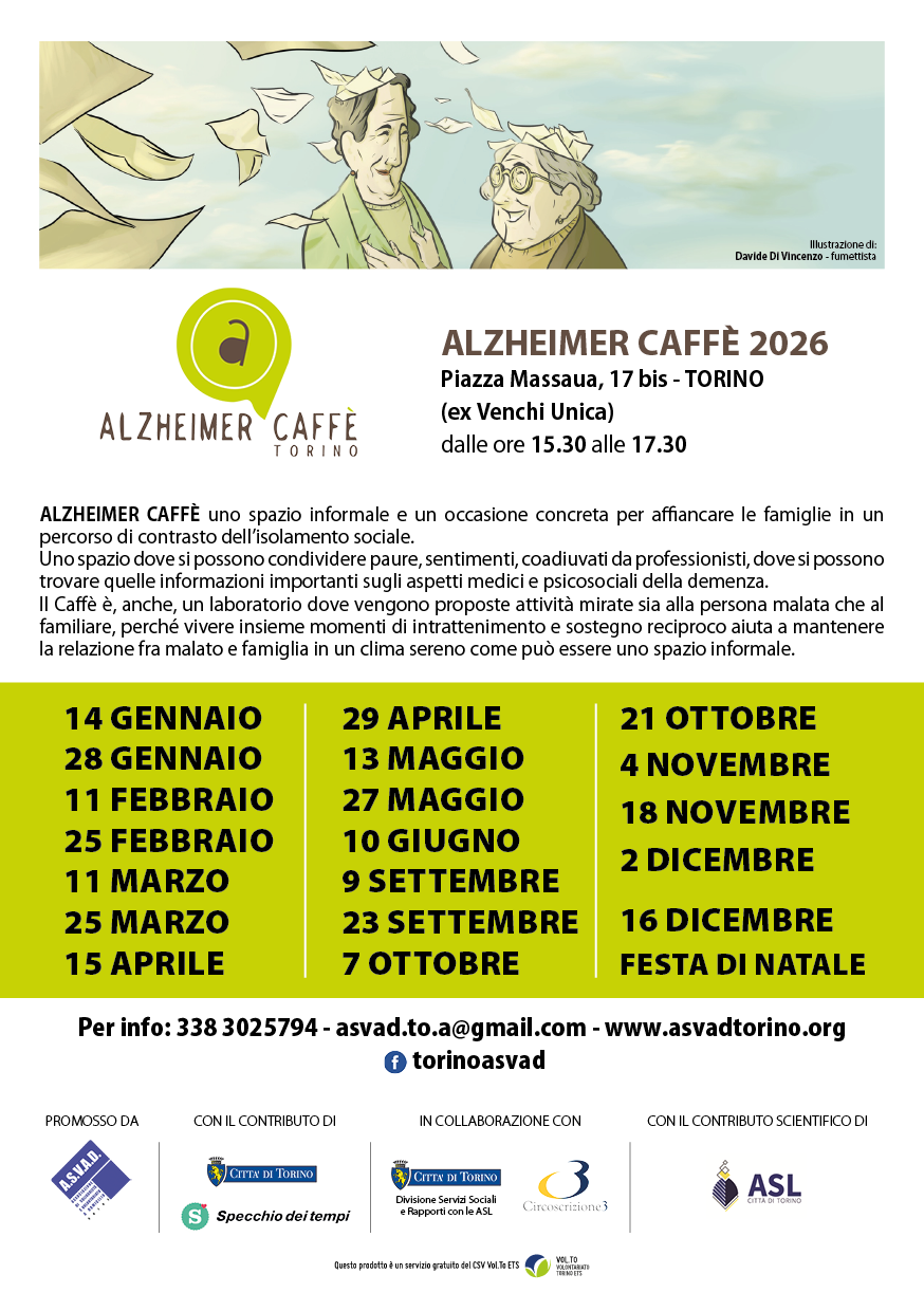 L’Asvad Torino promuove il progetto Alzheimer Caffè Torino: … un luogo informale in cui malati di demenza e i loro familiari possono recarsi insieme e combattere l’isolamento e capire come far fronte alla malattia… …un’opportunità per avere informazioni sugli aspetti medici e psicosociali della demenza attraverso l’incontro con professionisti… …l’occasione per promuovere la socializzazione e il benessere attraverso il confronto tra i familiari dei malati di demenza… …un momento terapeutico per il malato con intrattenimenti occupazionali utili ai fini della socializzazione e del benessere psicologico… Durante l’Alzheimer Caffè Torino sarà possibile assistere alle conferenze con gli esperti della malattia(psicologi, geriatri, infermieri…). Gli incontri si tengono in tre sedi: Piazza Massaua 17 bis (zona ex-Venchi Unica, circoscrizione 3) dalle ore 15,30 alle ore 17,30 (anche con Gruppo di ascolto per Caregiver); Programma Piazza Massaua 17 bis Via Rubino 45 (Cascina Roccafranca, circoscrizione 2) dalle ore 15,30 alle ore 17,30 Programma Via Rubino C.so Belgio 91 C/O Centro d’Incontro, Circoscrizione 7 dalle ore 15,30 alle ore 17,30 Programma C.so Belgio 91 Per ulteriori informazioni contattare: – via e-mail: asvad@katamail.com – cell: 333/6525409 Le attività degli Alzheimer Caffè – A.S.V.A.D. riprenderanno nel mese di Settembre 2025 PERCORSO DI GRUPPO PER LA GESTIONE DELLO STRESS Il corso si rivolge ai familiari di persone affette da demenza ed è finalizzato ad acquisire strategie per la gestione dei disturbi cognitivi e delle problematiche psichiche comportamentali nella vita quotidiana. Percorso di gruppo: – riconoscere i segnali dello stress; – gestione dell’ansia e delle situazioni difficili; – comunicazione non verbale; – la cura di sé e del proprio benessere Gli incontri saranno 8 e avranno inizio nel mese di Febbraio 2022 e saranno svolti in orario pomeridiano in presenza o via Skype. Per prenotazioni cliccare qui RIAPERTURA ALZHEIMER CAFFE’ Dopo la lunga pausa dovuta al Covid19 gli Alzheimer Caffè riaprono pronte ad accogliere i famigliari dei malati di Alzheimer. L’esperienza di questi mesi ci ha permesso di comprendere più a fondo la fragilità di quelle famiglie che si occupano di un anziano fragile. In particolare è emerso un importante sentimento di solitudine, che si è enfatizzato durante il periodo del lockdown, con la sospensione di tutti i servizi pubblici di sanità e assistenza. L’associazione nel periodo del lockdown ha organizzato un servizio di monitoraggio telefonico a cadenza settimanale e unitamente sono state inviate per e-mail materiali per la conduzione di attività ludico-creative e attività occupazionali da realizzare in autonomia a domicilio. A questi interventi, si è affiancata la realizzazione di video che illustrano le attività solitamente condotte presso gli Alzheimer Caffè. In occasione del mese di Settembre dedicato, come ogni anno, all’Alzheimer l’Associazione ha programmato degli incontri limitati e su prenotazione per un massimo di 20 utenti a Caffè. Dato che il progetto coinvolge un tipo di utenza ad alto rischio di complicanze da Covid19, è stato deciso di limitare le attività ai soli famigliari per ridurre gli spostamenti degli anziani fragili ed eventuale rischio di esposizione al virus. Contestualmente l’Associazione manterrà attiva l’attività a distanza: -chiamata settimanale di controllo; -sostegno psicologico telefonico; -invio per e-mail di materiale ludico-creativo/attività occupazionale; -pubblicazione ed invio di video per attività a domicilio; -training di stimolazione cognitiva in collaborazione con la scuola di specialità di neuro-psicologia dell’Università di Torino. ATTIVITA’ IN EMERGENZA CORONAVIRUS WhatsApp, Skype, Zoom, videoconferenze: sono alcune delle parole che sono entrate nel nostro vocabolario quotidiano. Nel momento in cui abbiamo sospeso le nostre attività in presenza per le persone con demenza, l’Associazione si è trovata ad affrontare un momento di necessaria riorganizzazione. Il servizio di supporto psicologico, le attività ricreative sono state trasferiti online, con qualche difficoltà, ma in alcuni casi questo nuovo modo di incontrarsi si è rivelato una nuova opportunità per avvicinare coloro che difficilmente riuscivano a partecipare agli appuntamenti e invece sono vicini ai loro congiunti nelle varie occasioni di incontro online. Link utile per le attività in remoto: Attività: L’abbigliamento https://www.youtube.com/watch?v=Vp-Hs7zynQ0 Stimolazione sensoriale: https://www.youtube.com/watch?v=WvlXf5WU85E L’alimentazione: https://www.youtube.com/watch?v=GLLPxbe7r_g Caffè e canzoni: https://www.youtube.com/watch?v=47vOzvlk1Ic Respirazione addominale: https://www.youtube.com/watch?v=QXcGutBg3Wg&t=87s Stimolazione sensoriale: https://youtu.be/uZ17eADFyzs Ginnastica a distanza: https://youtu.be/0-WWfg106dQ Caffè e canzoni- Piemontesina Bella: https://www.youtube.com/watch?v=trsDxx8QiYg Stimolazione cognitiva https://www.youtube.com/watch?v=NcPLv6IoQcA Tutti al supermercato: https://www.youtube.com/watch?v=4ubSCz_k7-o&t=3s Strategie per l’Igiene personale: https://www.youtube.com/watch?v=6BGK6DuaGOg Stimolazione cognitiva- Il gioco dell’oca: https://www.youtube.com/watch?v=TQNB77fNYaw Stimolazione cognitiva- La tombola https://www.youtube.com/watch?v=ITZ5hQbc3ko Esercizi di grounding: radicamento al momento presente https://www.youtube.com/watch?v=_3vTz2rD8iU DIECI CONSIGLI UTILI: Mantenere e stimolare le abilità cognitive e motorie delle persone con demenza, stimolare il loro benessere psicofisico e supportare i familiari nelle gestione quotidiana sono gli obiettivi di questo decalogo di consigli che aiuta ad affrontare al meglio la giornata in questi mesi di emergenza in cui la vita di tutti i giorni è cambiata, limitata, complessa da gestire. 1.- FOTOGRAFIE Riprendere vecchie foto e oggetti del passato, rior